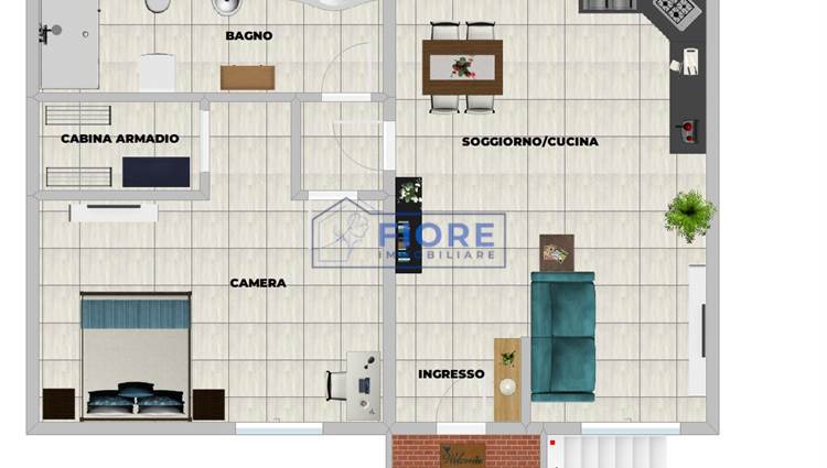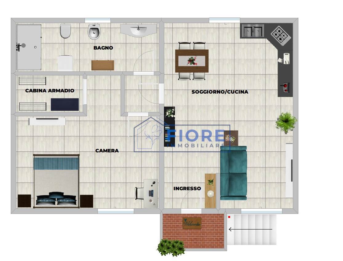 L’ingresso conduce a un luminoso soggiorno con cucina a vista, un ambiente accogliente e perfetto per vivere la quotidianità. La zona notte, ben separata, è composta da una camera matrimoniale con cabina armadio e da un bagno finestrato con vasca.