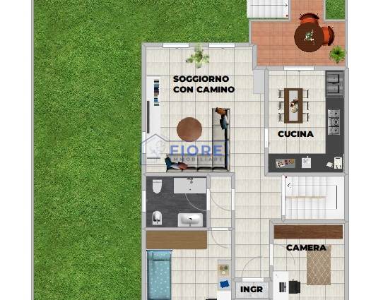 L’abitazione è composta al piano terra da ingresso, luminoso soggiorno con camino, cucina abitabile con accesso al terrazzino e al giardino, due camere da letto e bagno.