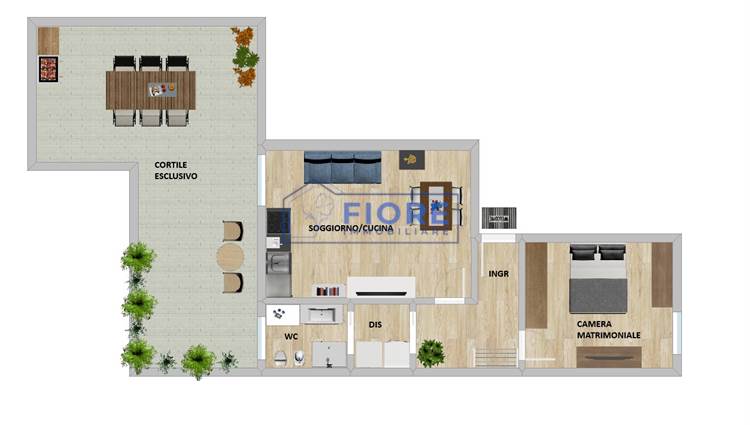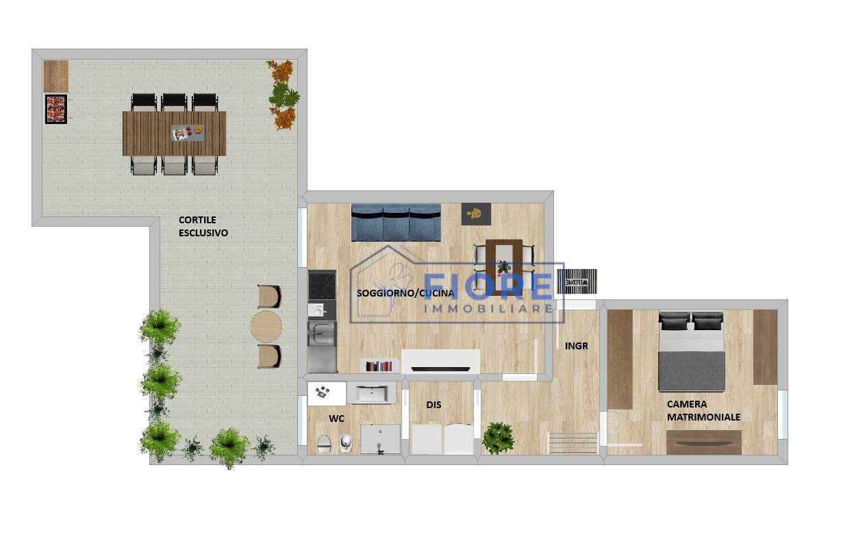 L’appartamento si apre su un ingresso che introduce a un raffinato soggiorno con angolo cottura, valorizzato dall’accesso diretto all’esclusiva area esterna privata, ideale per momenti di relax o per creare una suggestiva zona outdoor. Un funzionale disimpegno conduce alla zona notte, composta da un bagno e da una confortevole camera da letto. Completa la soluzione un posto auto di proprietà.