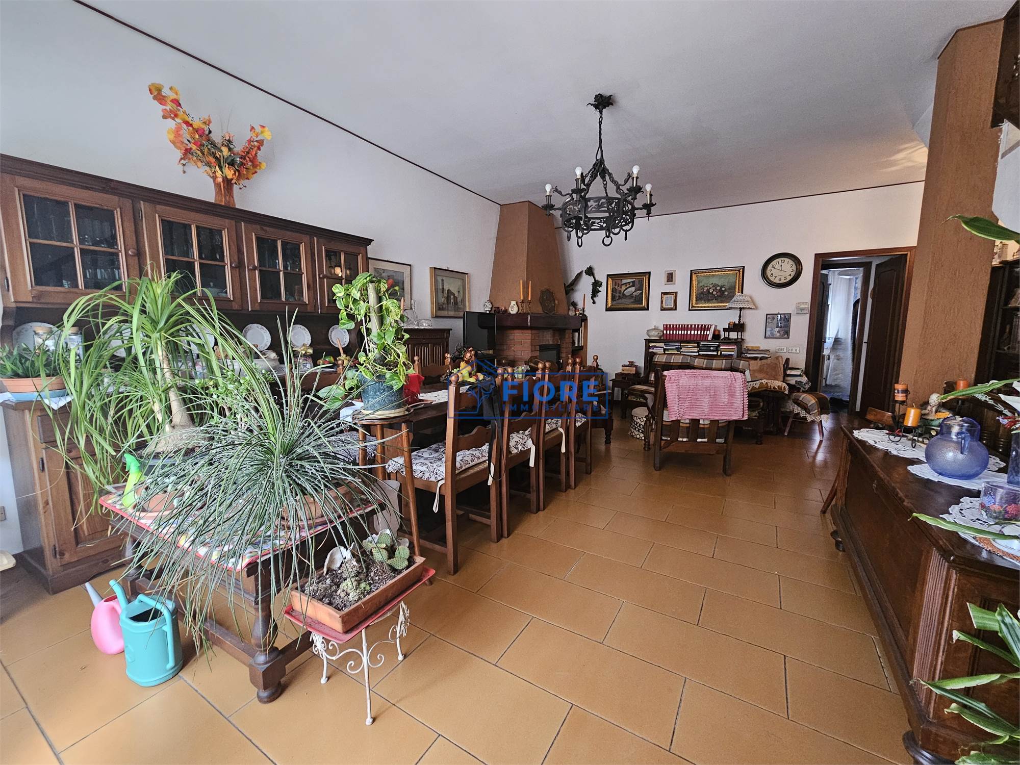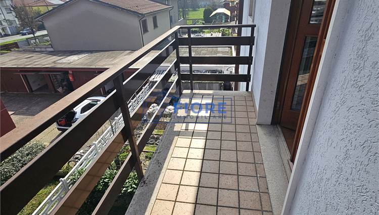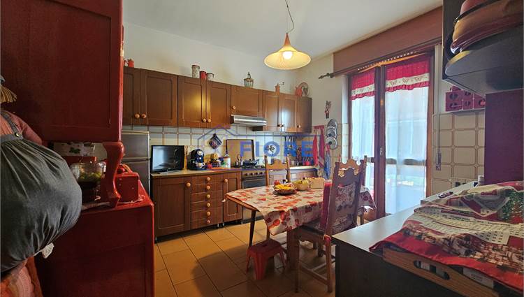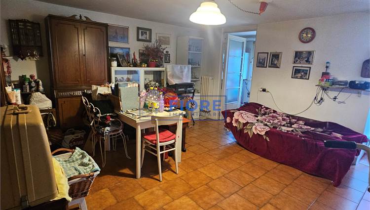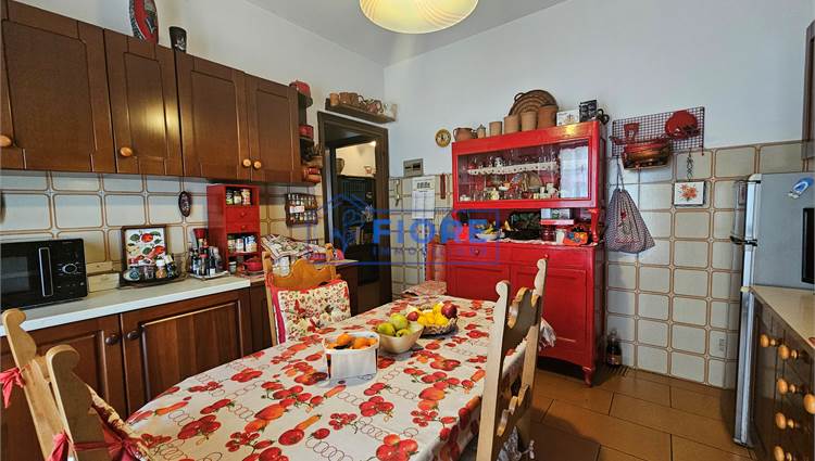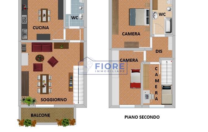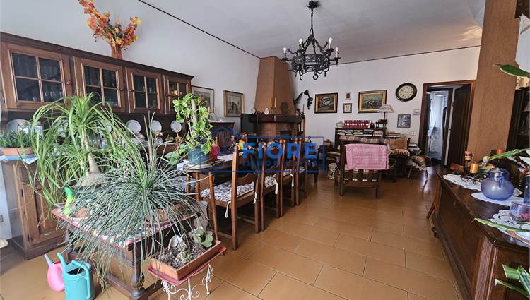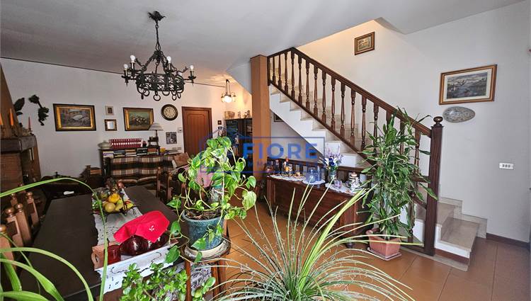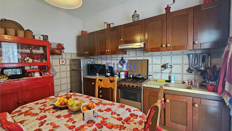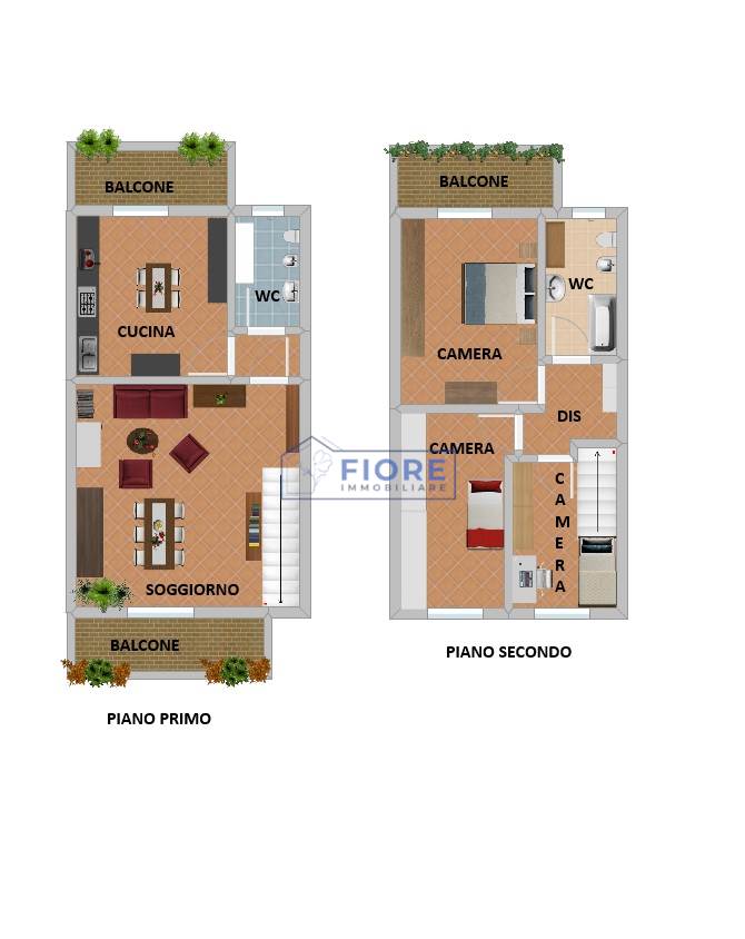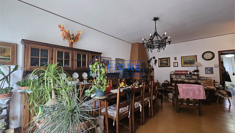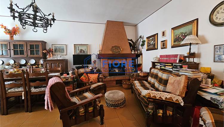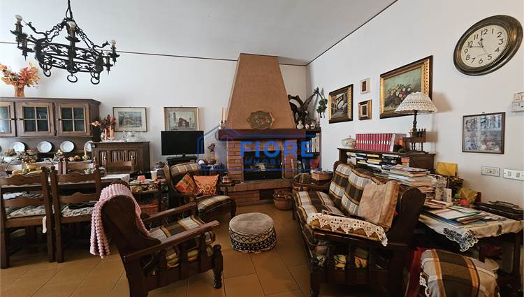 Piano primo: luminoso soggiorno con camino e balcone, cucina abitabile con balcone e bagno.