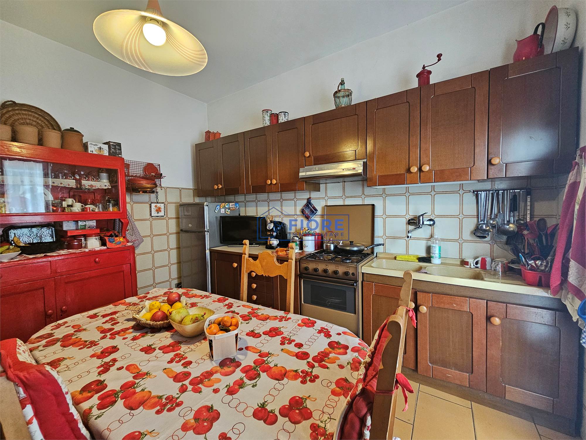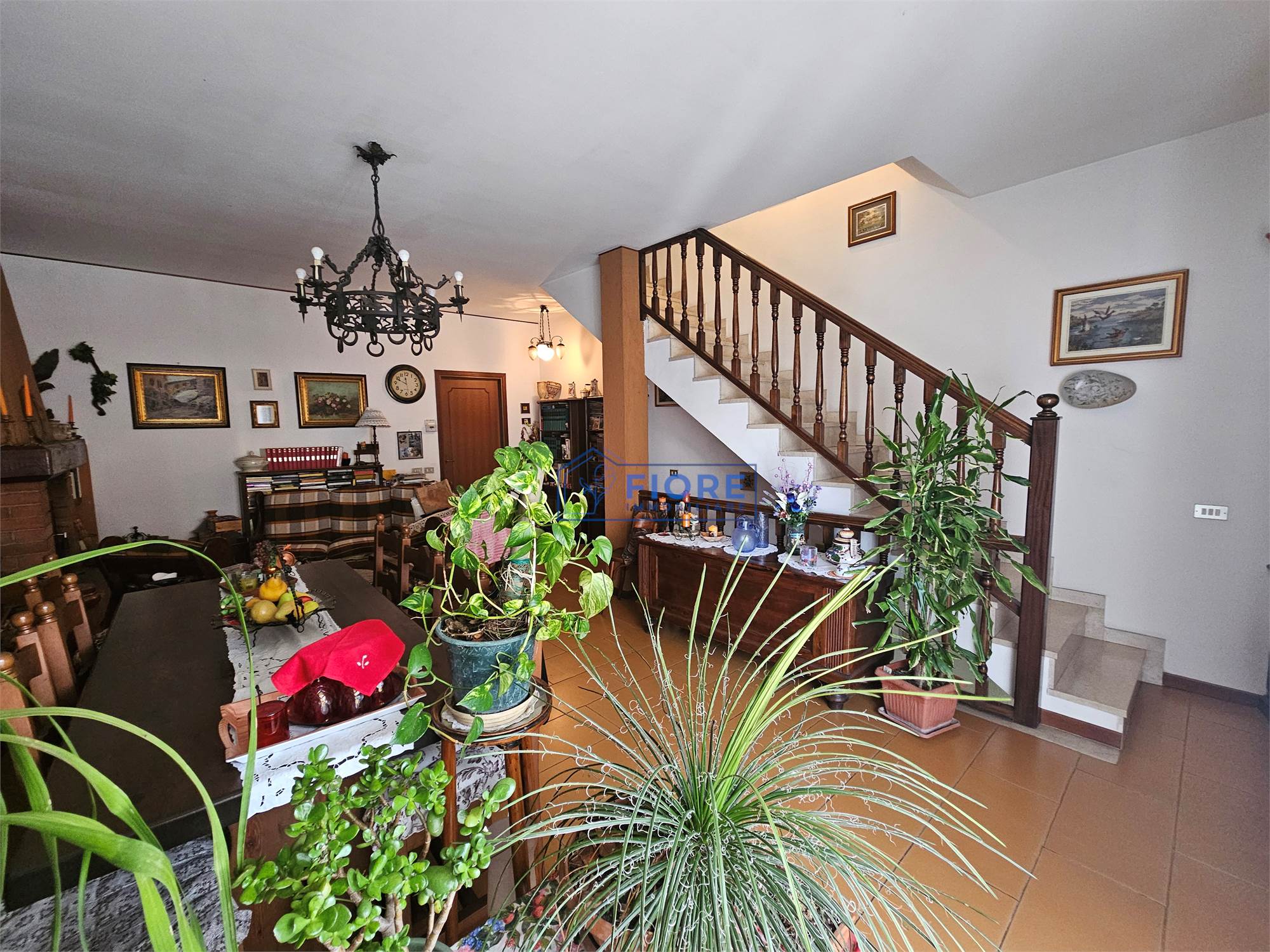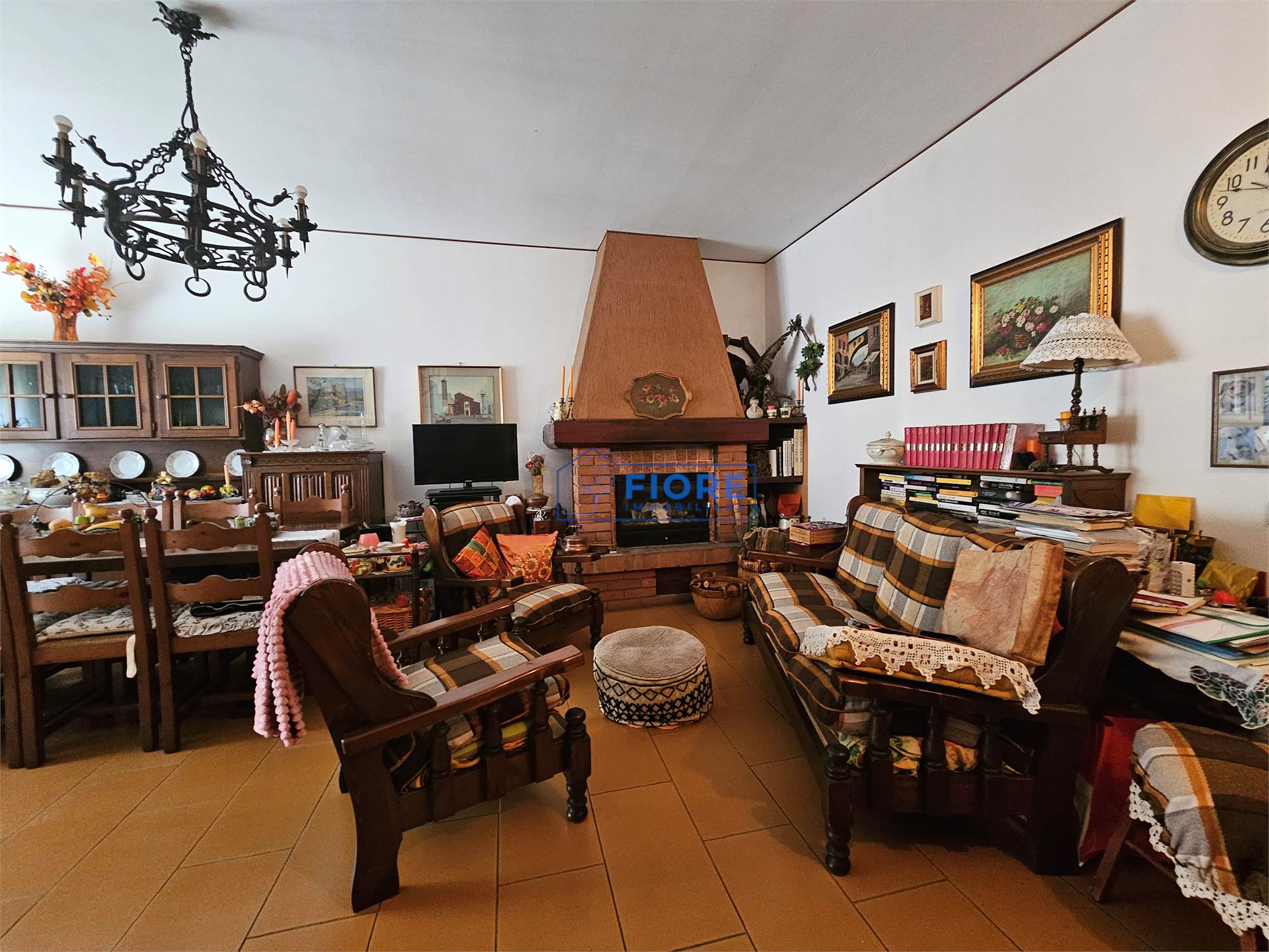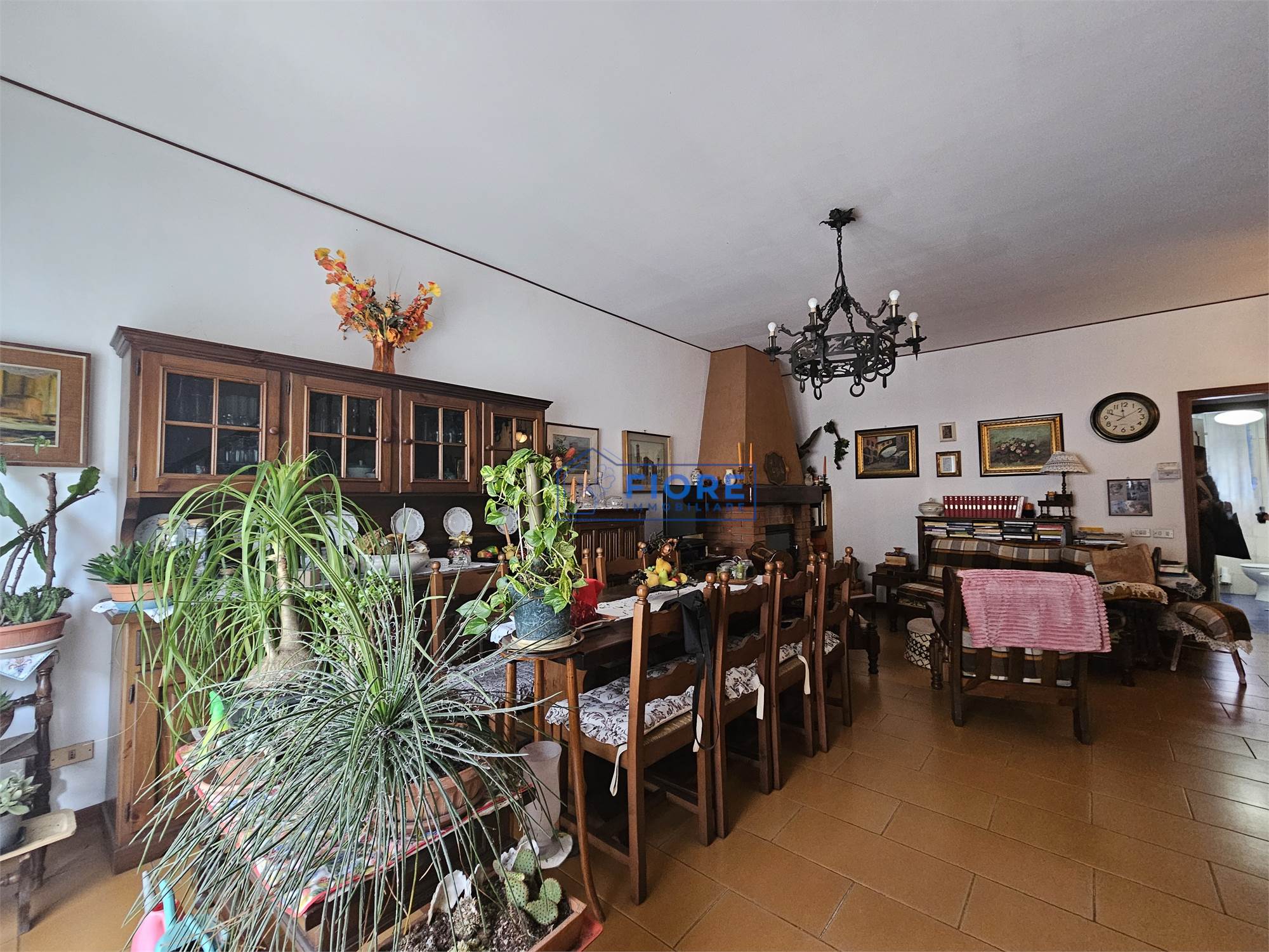 Piano primo: luminoso soggiorno con camino e balcone, cucina abitabile con balcone e bagno.